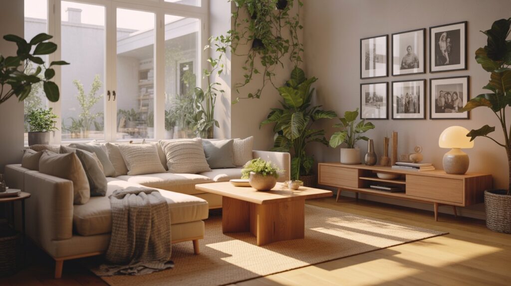 Elementos clave: muebles de madera clara, textiles en tonos fríos, luz natural, plantas verdes, toques minimalistas.