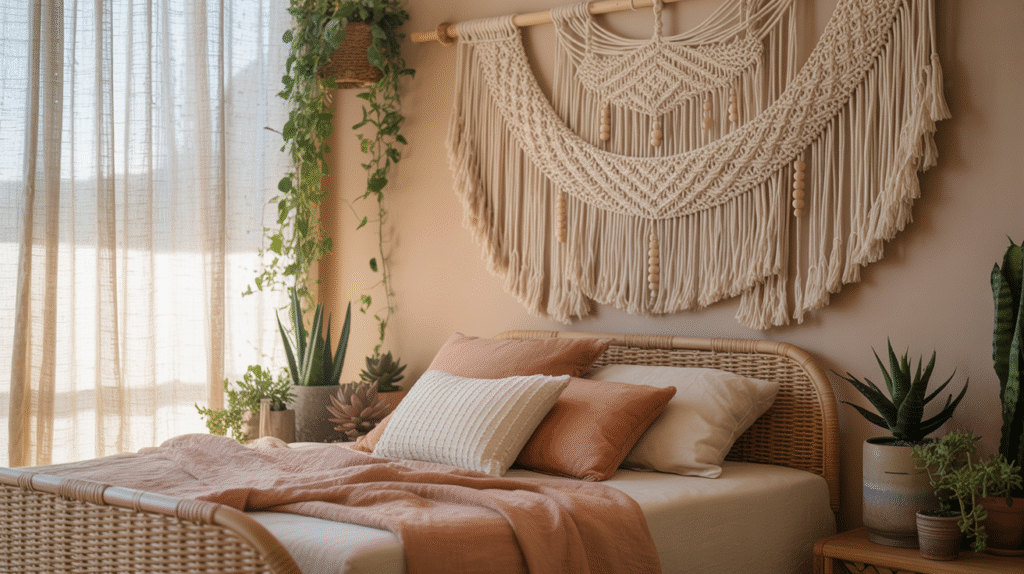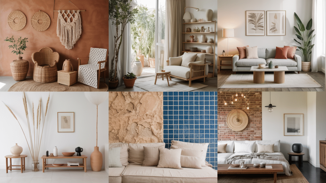 Elementos clave: mandalas, cojines bordados, alfombras kilim, cestos de mimbre, tonos arena, terracota y mostaza.