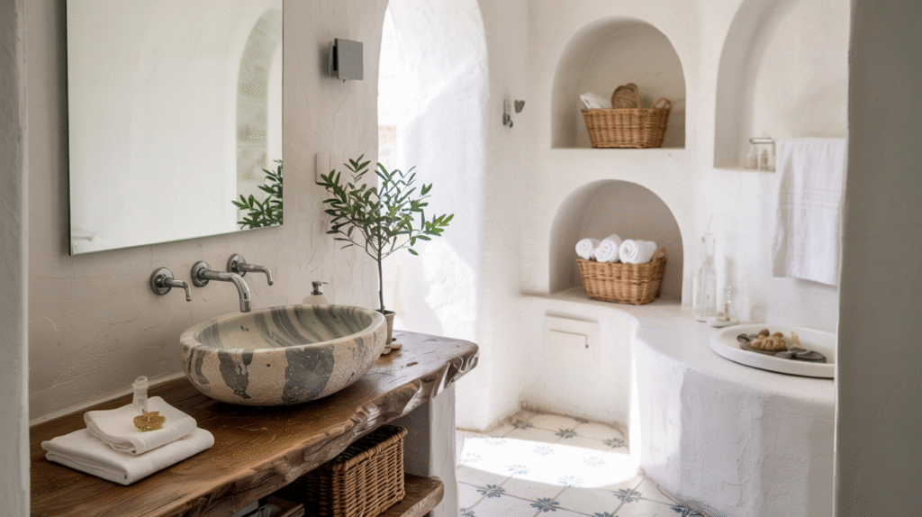 Elementos clave: arcos, azulejos, lino, blanco roto, azul mediterráneo, materiales como la piedra o la madera envejecida.
