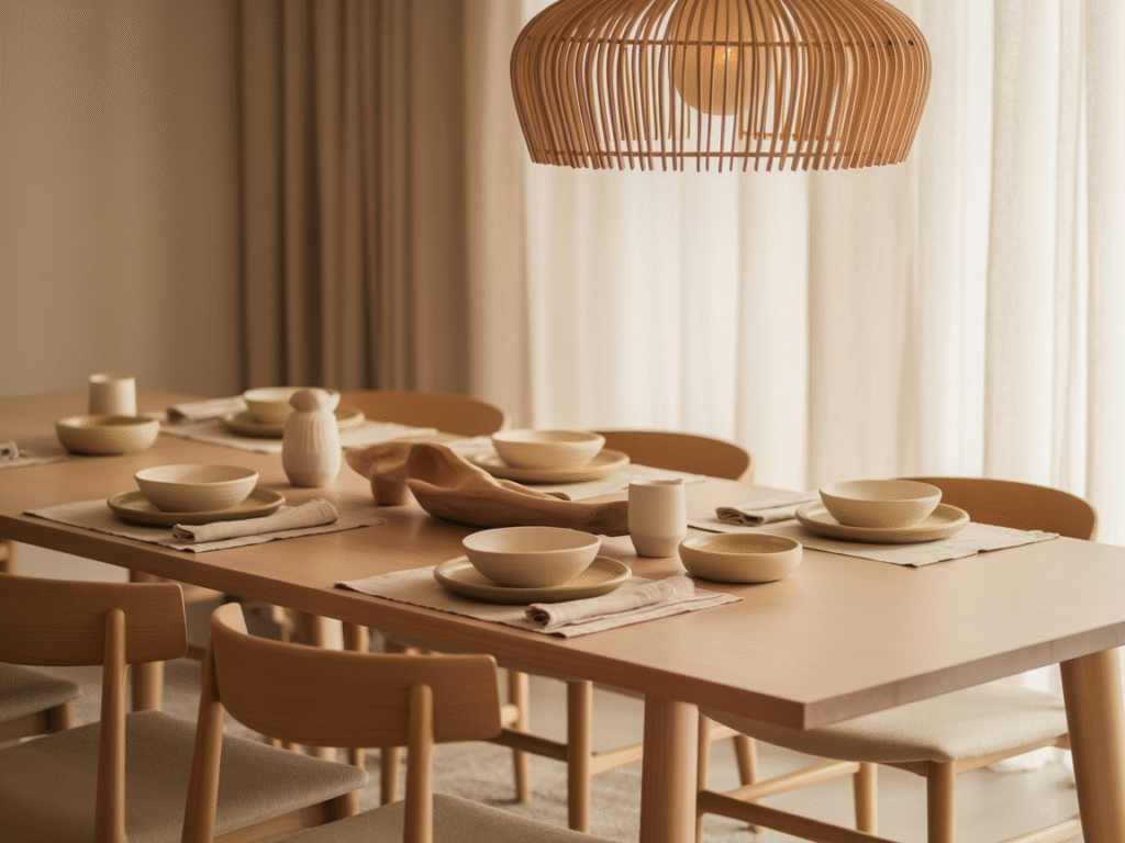 El comedor Japandi es un espacio donde cada detalle transmite armonía. Mesas de madera, vajillas artesanales y lámparas naturales crean una atmósfera perfecta para disfrutar con calma.