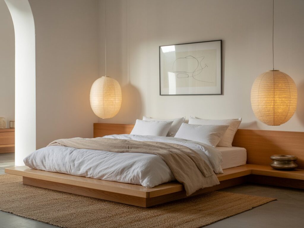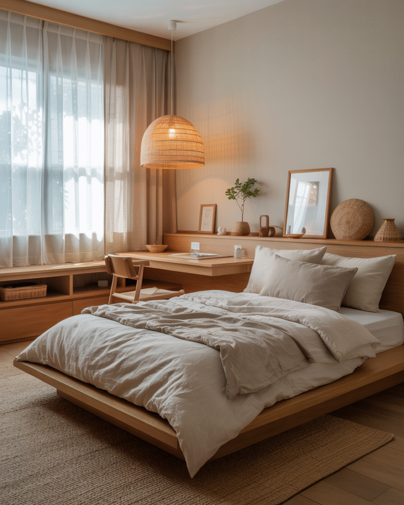 En el dormitorio Japandi reina la serenidad. Las líneas puras, los materiales naturales y la luz cálida crean un refugio de descanso y equilibrio.