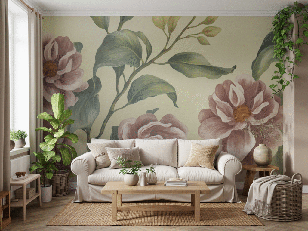 El papel floral llena el salón de vida y frescura. Desde motivos botánicos grandes y llamativos hasta flores sutiles en tonos pastel, este estilo invita a la calma y la naturaleza. Perfecto para quienes desean un espacio acogedor, alegre y con un encanto atemporal.