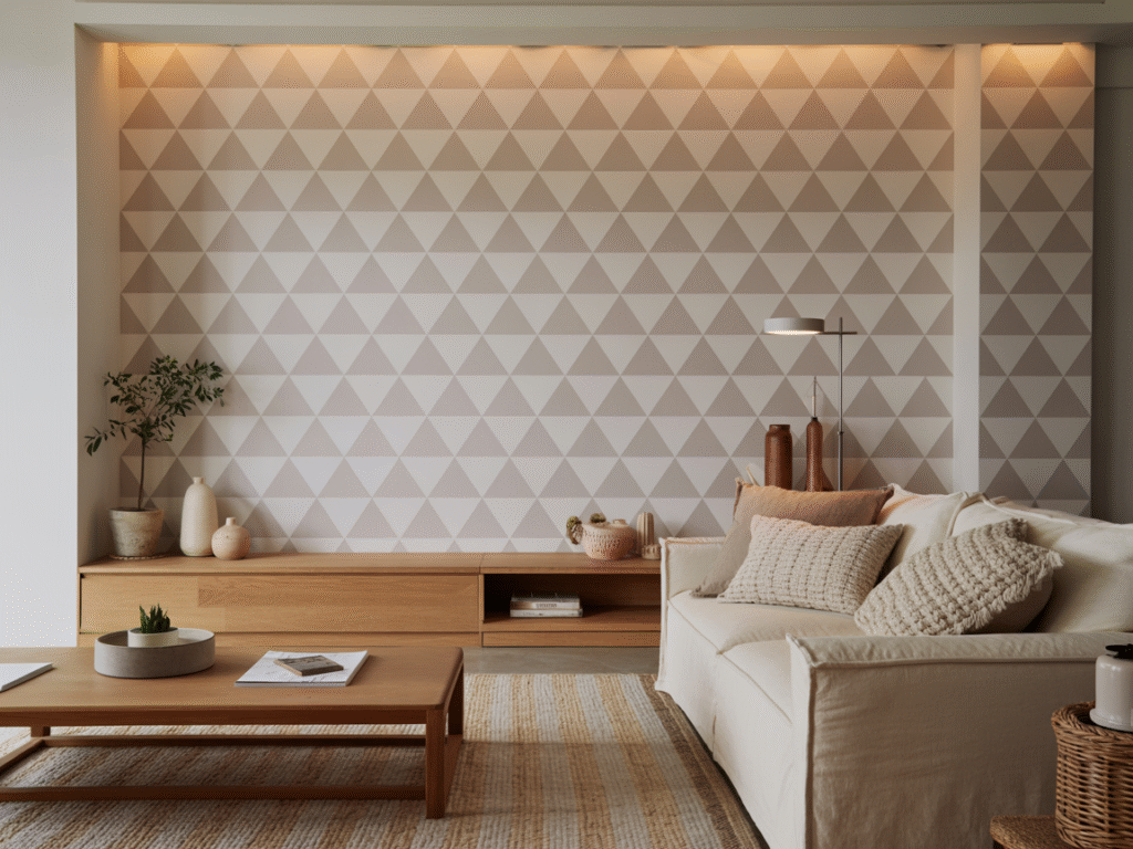 El papel pintado geométrico aporta dinamismo y carácter al salón. Sus líneas, triángulos o patrones entrelazados crean una sensación moderna y equilibrada. Ideal para quienes buscan un ambiente contemporáneo sin perder calidez, combina muy bien con muebles neutros y detalles en madera clara o negro mate.